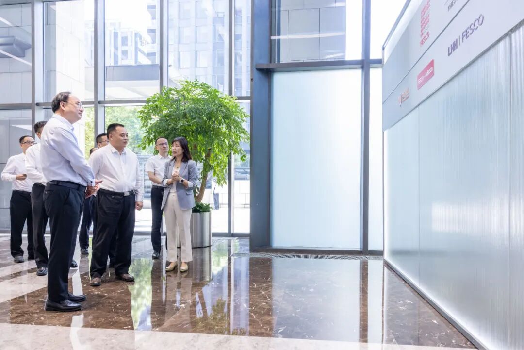 蔡坚带领汪局长一行参观外企德科大厦,结合企业文化、人力资源服务产业生态圈、企业发展历程和高光时刻做了简要介绍。